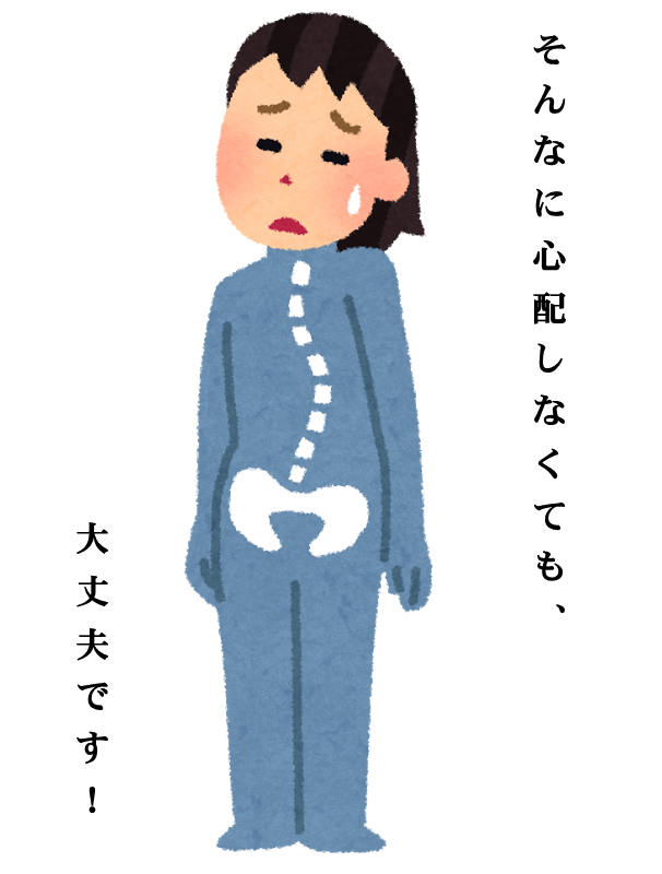 みなさんの周りには、見た目に背骨が曲がっている人でも、特に症状もなく元気で生活をしているご老人は沢山(普通に)いますし、そもそも左右が完全に対称の人間(生物)など存在しません。