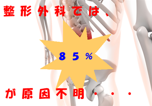 こうした事実が明らかになったことから、現代医学(整形)では、原因が特定できる特異的腰痛というのは全体の15パーセントに過ぎず、残り85パーセントは原因がよく分からない非特異的腰痛であるとしています(参考:2012.整形外科診療ガイドライン)