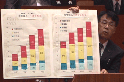 6月11日(木) 「これ以上の負担増に、市民は耐えられると思うのか。」 今回、いよいよ負担増を求める引き上げ案を提案して来た段階で、あらためて、菅谷市長に「これ以上の負担増に国保加入者が耐えられると思うか。きちっとした答弁は難しいとした前議会を踏まえての答弁を」求めた。