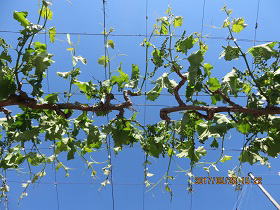 | (左) 巨峰でっせ。これからいよいよ房づくり。これからこれをなんと3.5センチまで切りつめます。 (右) ただいま誘引作業中。こちら2-8紫玉と3-8紫玉の接続地点。ぱっと見ではどこが境い目かはわかりません。 |