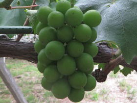 | (左) 樹木No5-1紫玉。ゴツゴツした力強い粒。ただしこの人着色が不安定で、出来のいい年と悪い年がはっきりしています。 (右) 樹木No8-1高墨。今年の失敗の1本。1回目ジベレリン処理のタイミングが3日ほど早かったです。早いと粒が軸からぴろーんと離れてしまいます。着果量を減らして今年はお休み。 |