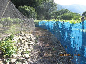 | (左) 1デラの最上段には電柱が立っていてここがバカラスのたまり場になっています。毎年この時期100房とか200房とかのデラ姫がバカラスの餌食になってしまいます。今年はそうなる前に電柱の下付近のバカラスにとってよく見えるところ(?)に必殺仕掛人式首つり模型カラスを吊るしてます。効果あるのかな??。しかし聞いたところによるとこれを見てギョッ!!としたのはとなりのデラ園の園主のマコちゃんであったという。 (右) 防風兼防鳥ネット。青いのがマコちゃん、黒いのが自分。マコちゃんとはいい友達です。 |