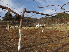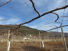 | (左) 東の正横綱翠峰に寄り切りで負けた東の小結伊豆錦は片枝を切られてしまいました。翠峰を活かしきるためにはやむを得ないという園主の苦渋の判断でした。 (右) 夕方、園主様の影が見える。Rainbowぶどう園西部地区にて接近している3本のぶどう木たち。クルガンローズ(左)と2本の翠峰。早ければ明日、遅くても1年後には3本が2本になる予定。全ては園主様のご意向次第であります。そう言ったら3人ともビビッてました。 |