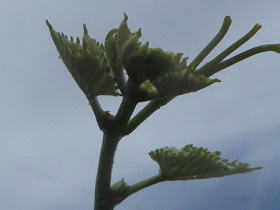 | (左) 早生系巨峰「紫玉」の一部に花が咲き始めました。 (右) 定植2年目の「クイーンルージュ」。赤系ぶどうの期待の星。 朝3時半起床の日々が始まりました。明日は半日かけて3デラの早生デラたちの2回目ジベ処理の予定。午後は第1巨峰園で誘引作業の続き。これから先、ピオーネやシャインに黄華たち、Rainbowではいろんなぶどうたちが早く房作ってくれと待っています。ぶどう作りシーズンがいよいよ佳境を迎えます。 |