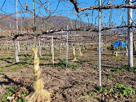 | (左) 昨日の第3デラウェア園。朝方は氷点下になる日がでてきました。いよいよ冬の到来です。 (右) 寒害を防ぐために若いデラ木には稲ワラを巻いてあげました。 |