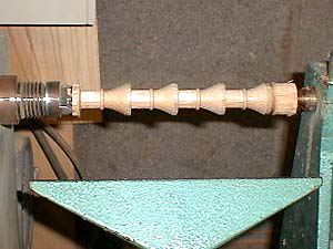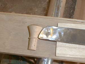 6)最初はつまみのホゾに当たる部分を削り(左)、次に、先に加工したバイトを当て、つまみの側部分を削ります。