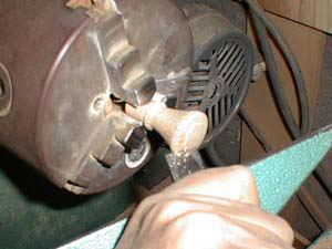 次にチャックという工具につまみのホゾ部分をはさみ込み、つまみの先端を丸く削り、ペーパーを当てれば、、、