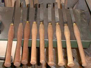 1)轆轤の機械(木工旋盤) 白い箱がスイッチと回転スピードのコントローラー。右は各種バイト(削る為の刃物)で柄は自分でろくろで作ります。
