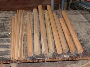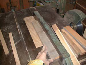3)木取り つまみにする木は、できるだけ年輪幅が小さく(これは作る人の好みにもよります)、木も素直なところを選びます。